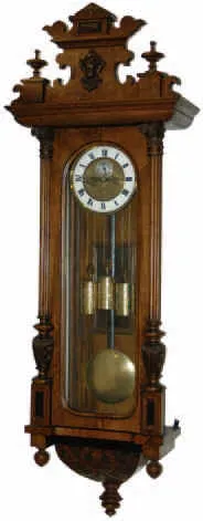 Vienna Regulator, 3 weights, strikes one quarter hour and hours, each quarter. Top and finials may not be original to this clock, always a puzzle but if in doubt we call them replaced.