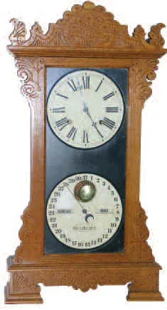 Ithaca Clock Co. shelf double dial calendar clock, "Mantle Index", ca. 1880.