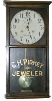 31 inches tall mahogany case, old refinish in a lighter stain. Nice old glasses, lower glass had advertising reading "C. H. Pirkey Jeweler", with fanc...
