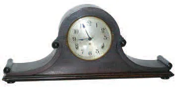 Original finish mahogany case is 9 inches high and 21 inches long, brass bezel with beveled glass, 5 inches silver dial, No. 89 8-day movement strikes...