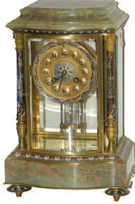 The clock is 13 inches high, two perfect pieces of green onyx used on the top and base. The onyx has brown and white veins throughout. The cloisonne o...