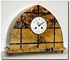 C.1930, French, Art Deco Mantel clock. The tan onyx case is offset by a cross hatch pattern of black marble. Has a good 8-day bell strike movement, but note the dial is damaged at the right winding hole and needs repair. Otherwise complete and sound; the flash blurred the numeral 9, but it is OK. Height 11.7'