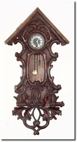C.1930, German, Black Forest Mini Wall clock, in a carved case of oak leaves and branches Ö has more detailed carving than any of this group, but without the top trim, and the case with dry splits.