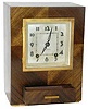 Deco styled case, 8.75 inches tall and 6.5 inches wide, walnut veneer. Functional drawer lower front. Silvered 4 inches square dial shows wear at chim...