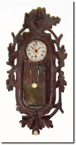 C.1930, German, Black Forest Mini Wall clock, in a carved hunting motif case of oak leaves and a deer head on top, distressed with several bits of carving broken away and missing; celluloid missing from door.