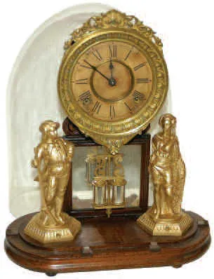 Original dial, pendulum, statues, and dome. Statues have been repainted. Dark oak base, mirrored back, 17.5 inches high. 8 day, striking on a nickel b...