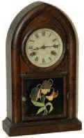 8 Day Round Gothic Striking. New Haven Clock Co., New Haven, Conn, on the complete paper label glued to the inside of the original glass, which is correct.