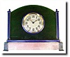 in jade and pink quartz, each piece mounted in silver, and accented with inlaid blue cobalt enamel. Has a good 8-day Swiss lever movement, in runningb order. Retains original dial and hands throughout. The numerals and hands no longer luminesce, however the paint is all intact and has not flaked off as is so common. A small clock of very high quality; height 4" (11cm) Reserve $2000