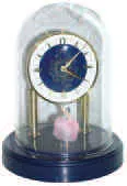 6 inches high and 4 inches wide glass etched dome, 1-day pendulum movement sits on two brass pedestals, winds from back. 3 inches blue and white dial ...