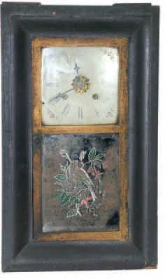 26 inches high veneer case, good condition, veneer on door removed, old glasses, hands, dial, pendulum, weights, good full Waterbury label inside. Nic...
