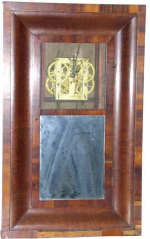 Mahogany veneer case, chips at lower edge, 26 inches high, good condition, good label inside. Old glass and mirror. Complete 30 hour time and strike m...