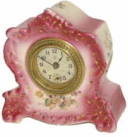 30 hour, time only movement encased in the miniature 6.5 inches high ceramic case. Deep pink and rose colored with applied decoration and gold highlig...
