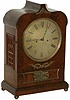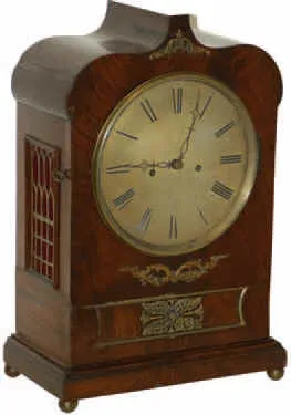 English double fusee bracket clock. Stylish mahogany veneer case is 18 inches high with brass ornaments on the front, brass ball feet, brass side windows (red cloth backing), and key locking brass bezel.