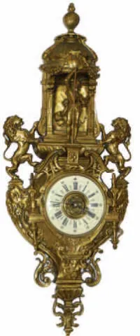 French heavy cast brass cartel clock, ca 1880. Well made 8 day French movement marked "AD Mougin", outside count, strikes on a bell, and is running.