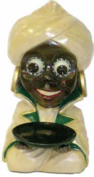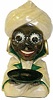 8.25 inches high composition body with removable wood hands, has original tip tray. The face is dark brown and the body and turban off-yellow or beige...
