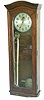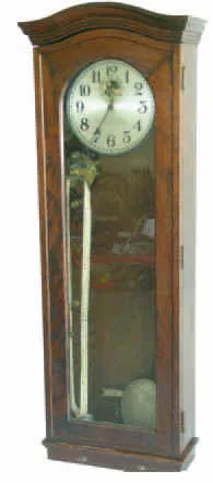 Mahogany case, original finish, 63.5 inches tall. Large master clock with electric gauge and bell tape intact, pilot clocks missing. Switches and lots...