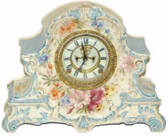 Light pastel colors on white base background. There are various shades of pinks and blues, some gold highlights. Movement is 8 day, striking a gong, e...