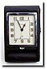 in folding leather covered case. Both the movement and the case are signed European Watch and Clock Co, which would have been the manufacturer and Cartier the merchandiser. There is wear to the edges of the leather on the case, and it bears the gold initials "ELK,Jr". This was about as good as it got for a depression era travel clock. Case 4 x 2 x 1 inch Reserve $400