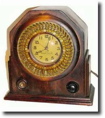 110 volt which can be set to illuminate a light at 5 minute intervals in a twelve hour period. For persons into medication reminders, or other interval functions, this is a well made clock. The case has its share of nicks and scrapes, but the movement is still running fine. Although not antique, few of these survived the move to quartz and then computer reminders. Height 10 inches $150-200