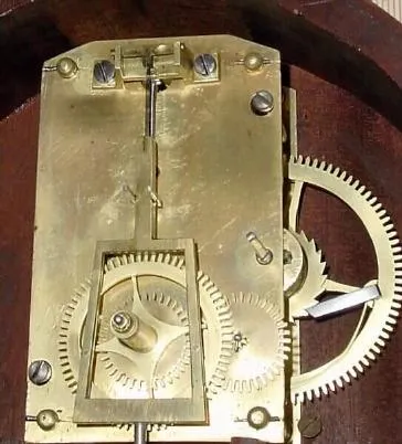 C.1815, Attributed to Simon Willard, Boston banjo, 1-weight, 8-day, with step train, T-bridge movement held in place with original fillister screws.