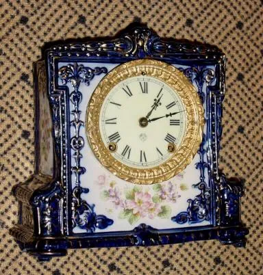 C.1910, Ansonia TITAN, porcelain china mantel clock, 8-day gong strike.