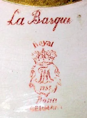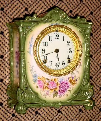 C.1901, Ansonia, La Barque, Royal Bonn, porcelain china mantel clock, 8-day gong strike.