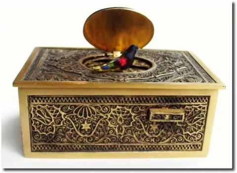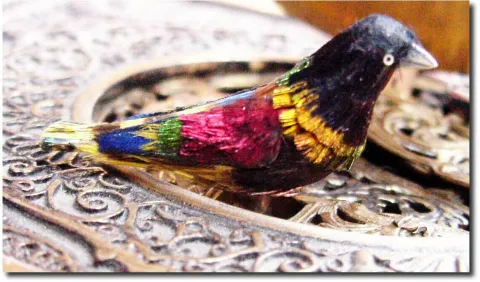 The bird retain his feathers in good condition (and quite colorful), and he sings his song crisply with plenty of volume, all the while fluttering his wings and opening his beak. The cast brass box has a filigree pattern on all surfaces of the outside, including the lid. See detail image, showing yellow, violet and green feathers. Box measures 2 x 4 x 1 inches high .
