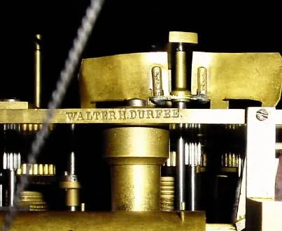 C.1900, Walter H. Durfee for Tiffany and Co., New York, oak cased 3-weight tall clock with 9 tubular bells, also marked with Durfee patent info. Plays your choice of Westminster or 9-bells (Whittington) on the quarter hours.