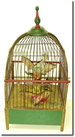 C.1950, German or Swiss, a novelty musical bird cage, with two animated birds that move with the bottom wind music box plays.