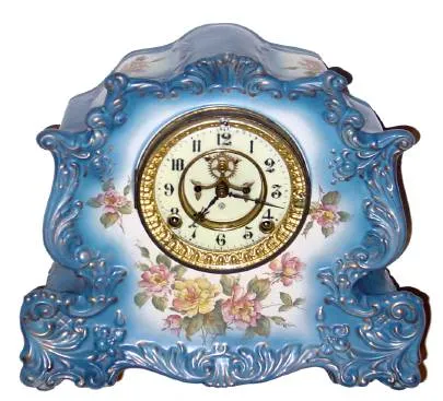 C.1901, Ansonia Clock Co., "Recluse", 8-day time and strike porcelain mantel clock, open escapement.