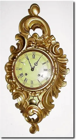 C.1950, Sweden, Ljungstrems Urinderal-fabrik, gilt wood cartel clock in the French style, with "Westerstrand' on the well painted convex dial (dial is painted yellow). These post war wall clocks were very popular in the "50s and are very well made. 8-day time and strike. A couple of trim tips reglued on case, but is a nice beginner"s clock. Height 22'