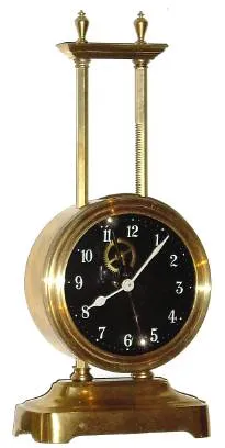 C.1921 English Gravity timepiece, the movement being driven by its own weight, and raised each day along a ratcheted upright and with exposed escapement and compound bar-bell pendulum.