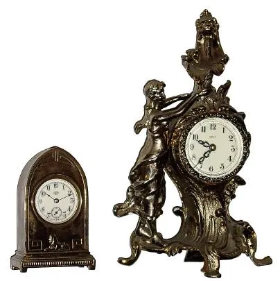 Lot of 2 novelty clocks: 1) Waterbury for Benedict Mfg, small cast metal desk clock,