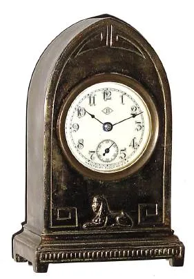 with Egyptian sphinx at base, 30 hour, ticks OK, Height 5.25 inches and 2) Modern repro of a New Haven 8-day figural clock, cast pot metal with antiq...