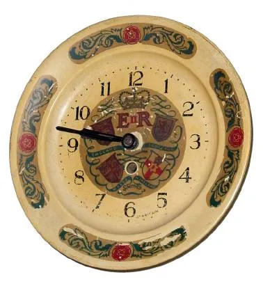 C.1953, Smiths English Clocks Ltd., 30-hour lever movement dish form timepiece, Elizabeth II crowning commemorative, as-found.