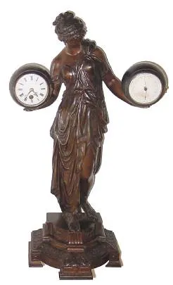 C.1890, French, Novelty Figural Clock, patinated spelter, figure of a woman holding a ball in each hand, her right hand with an 8-day timepiece, and her left with a barometer.