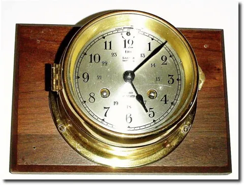 C.1965, German, "Sale m' Ship"s Bell striking wall clock, mounted to a rectangular piece of walnut.