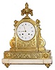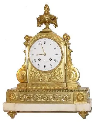C.1825, Belgian, Sarton a'Leige, Ormolu and marble architectural clock, with sprays of leaves, scrolls and surmounted by pineapple finials and a large urn surrounded by a cloth swag.