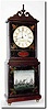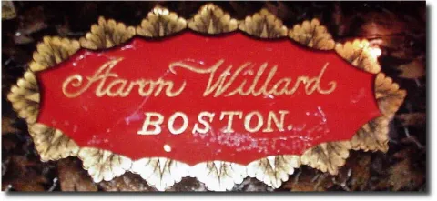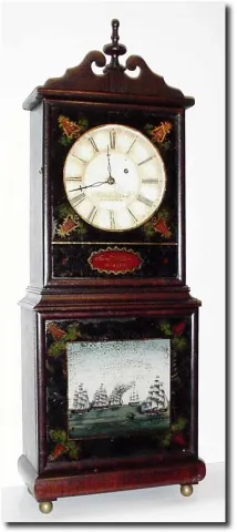 C.1970, A Reproduction Aaron Willard shelf clock. This is a well made mahogany clock with dished dial, well painted tablets and a good weight driven movement. Note the suspension spring was broken in transit. We seem to have a good repro shelf clock in each sale, and this one would fool many folks. The consignor paid $4200 + premium for this clock at a New York auction, where the clock was described as a "Willard Shelf Clock'. I believe our estimate more accurately reflects the value; Height 34'