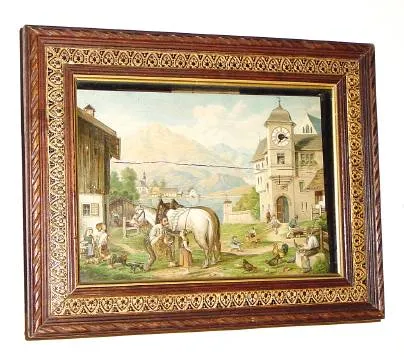 C.1920, German/Czech, folk art musical automaton and picture clock, one day with animation and music; music playing a few minutes, animation continuing longer.