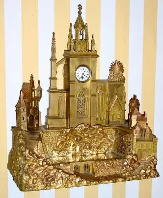 Mid 19th Century, French or Swiss, Clock in the form of a Cathedral complex, a mirrored pond in front of the church, formerly with music box, now absent.