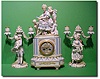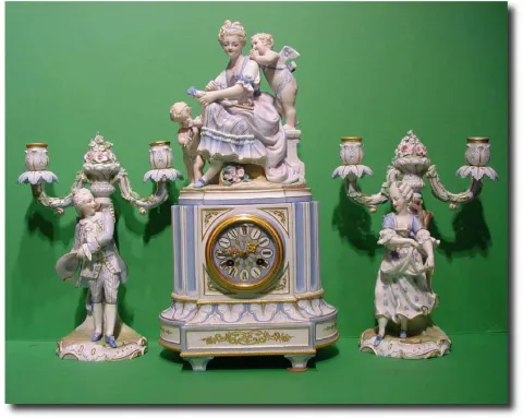 Capodimonte porcelain 3 piece garniture, the finely painted pale blue case with figure of maiden and two cherubs. The two-branch figural candlesticks are of a male and a maiden surmounted by flowers. 8-day French movement with hour and half hour strike on a bell. 17" x 9" x 7"
