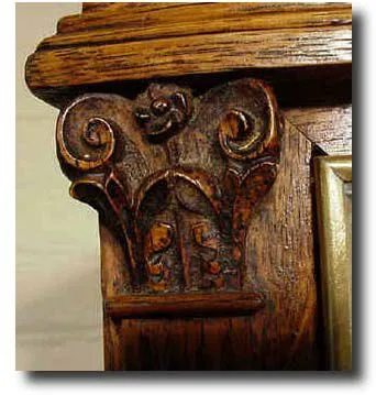 Oak case in Classical architectural design with Corinthian columns and the oak carved to model stone work. The dial is silvered brass. Probably made b...