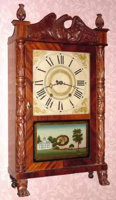 C.1832, Mitchell and Atkins, Bristol, Conn, short carved column with eagle splat, 30 hour wood movement.