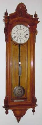 C.1885, Seth Thomas Clock Co., Thomaston, Conn, "REGULATOR No. 16" , 8-day single weight wall regulator, 12" dial and center seconds, with nickel appointments, in a /thin/ walnut case.