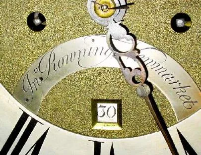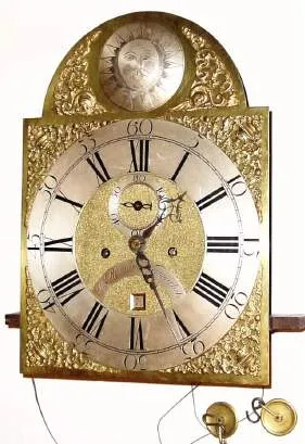 Movement ONLY, C.1780-1800, English, Ian Ronning, Newmarket, Brass Dial, 8-day tall clock movement with mat center, aperture above 6 for rolling calendar, and seconds hand.
