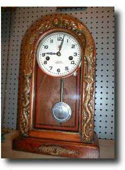 Chinese Mantel Clock, circa 1920 Wood hand-grained case with hand painted dial and brass self-correcting brass eight-day movement; nickel plated pendulum bob; brass bas-relief dragon motif surrounding the door frame. 17" tall x 10" wide at the base. Very good original and in good running order.