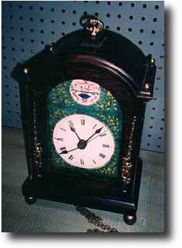 Mahogany case with brass knob finials, colorful hand-painted and fired porcelain dial, brass hour and minute hands and brass sweep seconds hand. Brass ball feet. With an internal pendulum and two brass weights - it strikes on the hour and has a sweep seconds hand and crownwheel escapement. It hangs on the wall with the continuous chain passing through the bottom of the case.13" tall x 8" wide. Good condition.