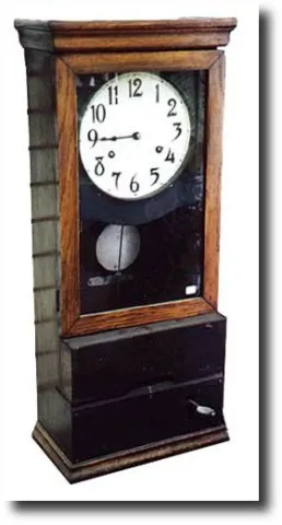8-day double wind time only upper movement with a time card punching lower movement. Pendulum driven. Oak case in nice original condition. Dimensions: 36"h x 16"w x 10 inchesd