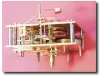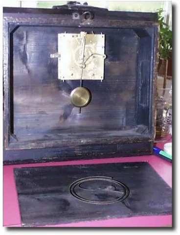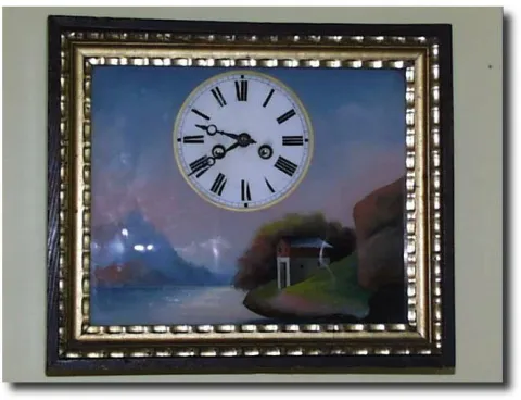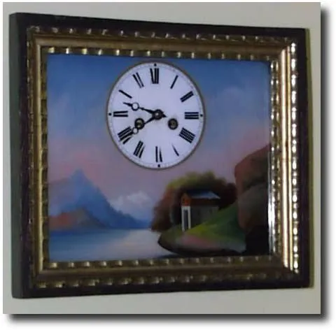 Case: Reverse painted glass with gilded frame; 14.5" wide, 12" high, 4.5" deep . Works: Original signed two train with barrel springs. 30 hour movement with hour strike and single strike on half hour. German or Austrian. Condition: Case; Excellent. Works; Excellent, cleaned, some old repairs.